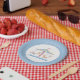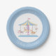 Sweet baby shower paper plate, done in blue and a white circle centre, with a pastel animal carousel, in the middle. Personalise the white arched text to suit your needs. Matching invitations and paper napkins are available.