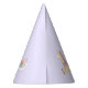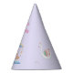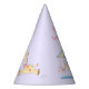 Cute paper party hats for baby's first birthday done in a light lavender with graphics of an animal carousel. Personalise the pink text for your little one's special day.