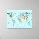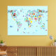 A map of the world featuring cartoon animals, famous landmarks, and buildings. A colorful, fun and exciting map for any young child to engage their imaginations. Light Blue Background.