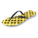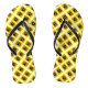 A geometric abstract pattern of a pet's paw prints in gold, yellow and black squares decorate these flip flops. Could be a cat, dog or other animal!