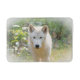 A captivating photographic artwork that showcases the regal presence of a majestic grey wolf amidst a vibrant green field and lush vegetation. The image captures the wolf's commanding stance and intelligent gaze, while its thick, textured fur harmoniously blends with the natural surroundings, creating a powerful and mesmerising scene.