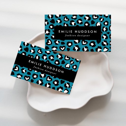 Elegant, stylish and sophisticated business cards with leopard spots and hearts in blue and black colour. Modern and trendy design, perfect for animal print lovers.