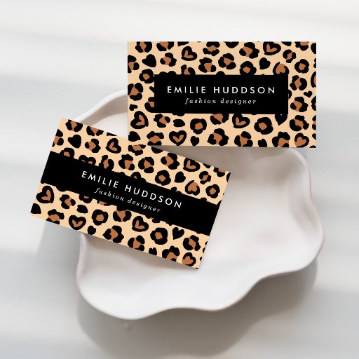 Elegant, stylish and sophisticated business cards with leopard spots and hearts in brown and black colour. Modern and trendy design, perfect for animal print lovers.
