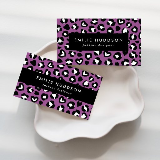 Elegant, stylish and sophisticated business cards with leopard spots and hearts in purple and black colour. Modern and trendy design, perfect for animal print lovers.