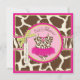 Wild and fun cheetah print jumper tutu on clothesline on an animal print background and 3D-look bow and ribbon for a girl baby shower invitation card. Colours are pinks, greens, and browns.