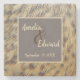 This coaster features an animal print photo of female duck feathers. The beautiful gold and dark brown spotted feathers curve and flow vertically on this coaster. A solid tan and grey square in the centre provides the background for the bride and groom's names and the wedding date.