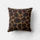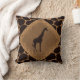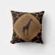 Giraffe silhouette on a safari themed square over an animal print background in shades of dark chocolate brown and tan.