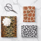 Wrapping paper in three animal prints - tiger print in deep amber / rust brown and tan with black stripes, giraffe pattern in shades of copper, beige, and chocolate brown, and a minimalist cheetah pattern of black spots on a white background