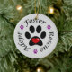 This Christmas ornament features a paw print with a red heart inside. Promotes animal rescue with the words adopt, foster and rescue separated with purple paw prints. Perfect gift for yourself or any animal lover. Animal shelters could use this item in a silent auction or raffle as a fund raiser.