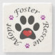 This coaster features a paw print with a red heart inside. Promotes animal rescue with the words adopt, foster and rescue separated with purple paw prints. Perfect gift for yourself or any animal lover. Animal shelters could use this item in a silent auction or raffle as a fund raiser.