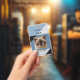 Name badge featuring your own custom photo or logo and texts on a geometric design blue and black background