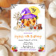 This cute and fun watercolor Halloween birthday party invitation features a pumpkin house and adorable animals in fancy dress. The text combines handwritten script and sans serif fonts for a stylish and modern look. Flower arrangements and spider webs add a rustic and spooky touch. This is perfect for a costume party or trick and treating.