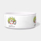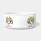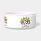 A cute, colourful Christmas holiday design pet bowl featuring a polar bear, penguin, and mouse all with scarves and ice skates with snow covered trees and text that reads It's Christmas!