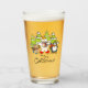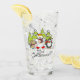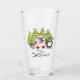 A cute, colourful Christmas holiday design drinking glass featuring a polar bear, penguin, and mouse all with scarves and ice skates with snow covered trees and text that reads It's Christmas!