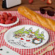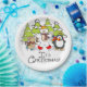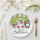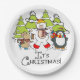 A cute, colourful Christmas holiday design paper plates featuring a polar bear, penguin, and mouse all with scarves and ice skates with snow covered trees and text that reads It's Christmas!