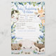 Boy covid baby shower games with cute animals wearing masks on a blue floral greenery background. These cute baby shower game flyers are double sided with two different games.