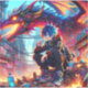 An anime boy with blue eyes with his dragon in an abandoned city in a dystopian world.