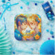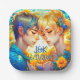 Personalised wedding paper plates for wedding reception or rehearsal dinner. Anime boy and girl cuddling surrounded by yellow flowers. Lots of blue details.