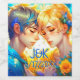 Personalised wedding wine or champagne labels. Anime boy and girl cuddling surrounded by yellow flowers. Lots of blue details.