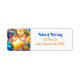Personalised wedding return address labels. Anime boy and girl cuddling surrounded by yellow flowers. Lots of blue details.