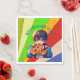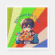 Personalised birthday boy paper napkins for a boy's pizza birthday party. Cute anime boy holding a piece of pizza with a colourful pop art background.