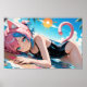Dive into summer vibes! This cute anime cat girl with vibrant pink and blue hair is soaking up the sun and surf on a tropical beach getaway.