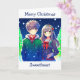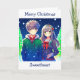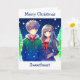 Christmas card with a cute anime couple with a snowy pine tree background.