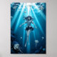 A mesmerizing underwater anime scene illuminated by glowing jellyfish and ocean light beams.