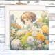Blank card. White and yellow watercolor flowers with a pretty anime girl sitting inside. Ai art.
