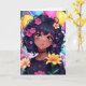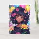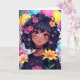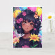 Pretty personalised birthday card for a girl. Cute graphics of a beautiful anime girl with darker skin and brown eyes with pretty pink flowers in her cute curly hair. These are cute for a teen or pre-teen girl. Colours are pink, purple, blue and yellow. This girl can represent anyone with darker skin such as Hispanic, Latino, Indian, Middle Eastern, African-American or Bi-racial.