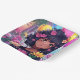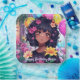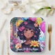 Pretty personalised birthday paper plates. Cute graphics of a beautiful anime girl with darker skin and brown eyes with pretty pink flowers in her cute curly hair. These are cute for a teen or pre-teen girl. Colours are pink, purple, blue and yellow. This girl can represent anyone with darker skin such as Hispanic, Latino, Indian, Middle Eastern, African-American or Bi-racial. Pretty magenta bokeh background.