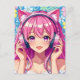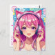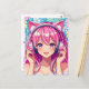 An adorable anime girl in headphones with cat ears listening to music with pink hair, purple eyes, and a floral background postcard to keep in touch with friends and family.