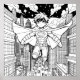 A colouring page with an anime boy superhero flying through the city skies. Cute colour me poster for a boy.