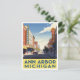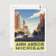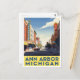 A nostalgic, vintage-style travel poster capturing the vibrant downtown atmosphere of Ann Arbor, Michigan. The design features the iconic Michigan and State Theatre marquees along a tree-lined street with a classic car. Perfect for University of Michigan alumni, residents, and collectors of retro college town and theater art.