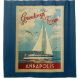 This Greetings From Annapolis Maryland vintage travel nautical design features a boat sailing on the water with seagulls and a blue sky filled with gorgeous puffy white clouds.