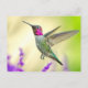 Postcard featuring a close up of an anna's hummingbird with iridescent green and magenta pink feathers, flying over hazy purple salvia flowers. Beautiful and unique card for hummingbird, garden and nature lovers. Photo taken in Pasadena, California.