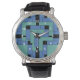 Annexe men's, women's, and kid's eWatch watches with white numbers. Annexe is an abstract design created by Vexenwraith and consists of turquoise and blue blocks on a black background.