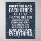 Our unique frameable print is easy to customise with your anniversary and your children's names and birthdates! Modern vintage typography design features the words "First we had each other, then we had you, now we have everything" with spaces for your wedding anniversary and four children's birthdays, on a navy blue background. Have two or three kids? Check our shop for an alternate version.
