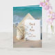A blank card is elegantly set against a beach backdrop, accompanied by delicate white gypsophila flowers, a starfish, and a sand dollar.