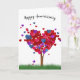 Red, pink, purple, and blue heart tree graphic with green grass on a white background for anniversary.