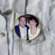 Happy Anniversary Circle Photo Template with Gold Frame. Button/Lapel Pin is ready to customise. Change the photo and/or change the text.
