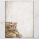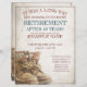 Announcement of retirement with old worn and weathered lace-up boots in vintage style. Gender-related text, the year, the honorary text, the date, the time, the place of celebration and RSVP can be customised.