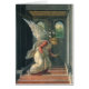 The Annunciation (detail) (1485) by Sandro Botticelli is a vintage Renaissance Era fine art religious portrait painting. The archangel Gabriel is holding a tree branch with flowers and kneeling in a house of worship. Light is streaming in through the windows of the church and the flowers the angel is holding resemble lilies.