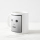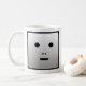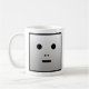 A simple square headed grey shaded robot with a blank look, has a kind of cute innocence, hasn't crunched too many numbers yet. The design is repeated on both sides of the mug.