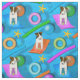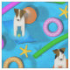 This charming Jack Russell / Parson Russell themed fabric features four illustrated terriers, each one standing on a floating mat in a crystal clear swimming pool with a tennis ball at her feet - the dogs have varied black and brown head and body markings, and each is tilting her head whimsically - the dogs are surrounded by various colourful pool toys, and you can see the shadows on the bottom of the pool - Jack Russell Terriers pool party pattern © katz_d_zynes 2021 | in the original pattern, the dogs are wearing cute swim rings around their necks | see it here https://www.zazzle.com/whimsical_parson_jack_russell_terrier_pool_party_fabric-256450286343191724