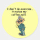 Mildred is a grey haired elderly lady with some pretty strong opinions! On this funny exercise theme design she states "I don't do exercise...it makes my coffee spill."! Humourous exercise theme T-shirts, mugs,bags, cards, stickers, magnets, keychains, ornaments, and more, sure to make yourself and others chuckle!
