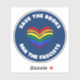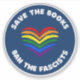 This sticker spreads a strong anti-censorship message with its "Save the Books Ban the Fascists" phrasing alongside a colourful rainbow heart on a blue circular background.
