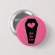 A black coffin with a girly pink broken heart on it, on a hot pink pin on button.