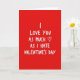 This bold card makes a strong statement with confidence and humor. A bright red background fills the design, setting a passionate tone right away. Centered in white, hand-drawn style lettering is the message, “I LOVE YOU AS MUCH ♡ AS I HATE VALENTINE’S DAY.” The contrast between the red and white makes the words easy to read and impossible to ignore. The heart symbol slipped into the sentence adds a touch of sweetness that balances the sarcastic edge. The lettering feels personal and relaxed, as if written just for the recipient. This card blends honesty, affection, and wit, making it perfect for someone who loves deeply but isn’t sold on Valentine’s Day clichés.