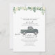 Illustration of a vintage blue truck decorated with greenery, flowers and tin cans over a white background with grey text and greenery floral design at top.